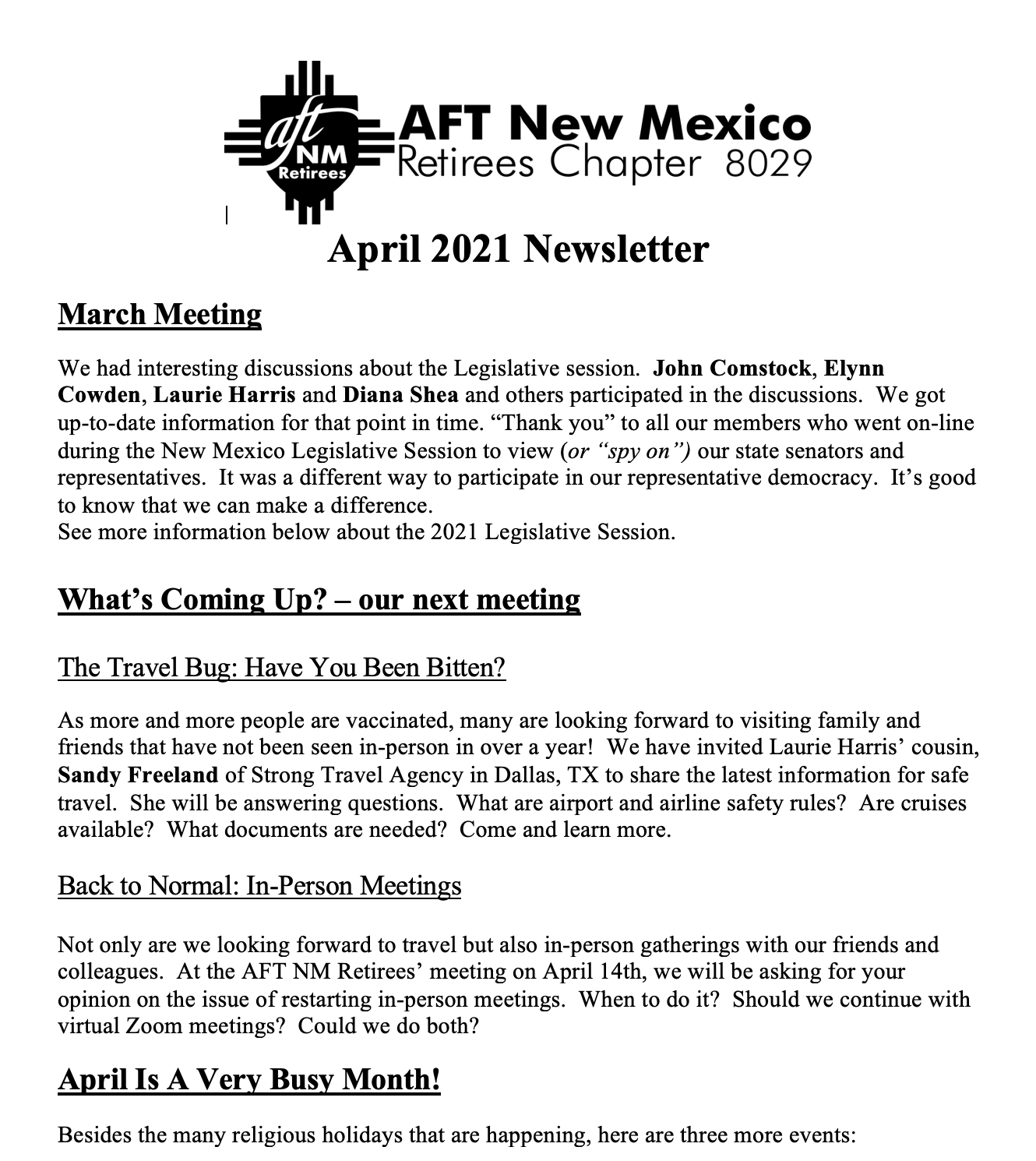 Negotiations: Six sessions with the state have been held thus, with three more scheduled in May. While negotiations are moving along at a relatively brisk pace, we are still in the initial stages of exchanging proposals. As might be expected, the state's original position on wages is far from what we might consider acceptable to the membership (this is normal). This should not be discouraging, as meaningful negotiations between the parties over wages have yet to occur. Discussions over contract language have been productive, with both sides in general agreement that certain sections of the contract need revision. Our contract, having been around for 40 years, is what can be described as "mature", meaning that we are essentially fine-tuning language to address issues that have arisen over the past few years. Our main concerns still revolve around firmly implementing a proper Telework agreement, securing fair wage increases over the next contract, and addressing issues related to the anticipated retirement wave in 2022 and its impact on staffing. As is often the case, the wage pattern ultimately offered to us will determine whether we can come to an agreement with the state. It is much too early in the process, with meaningful negotiations over wages yet to occur, so we can only report that we are still hoping to reach an agreement but we do not have a time-table for that to occur.