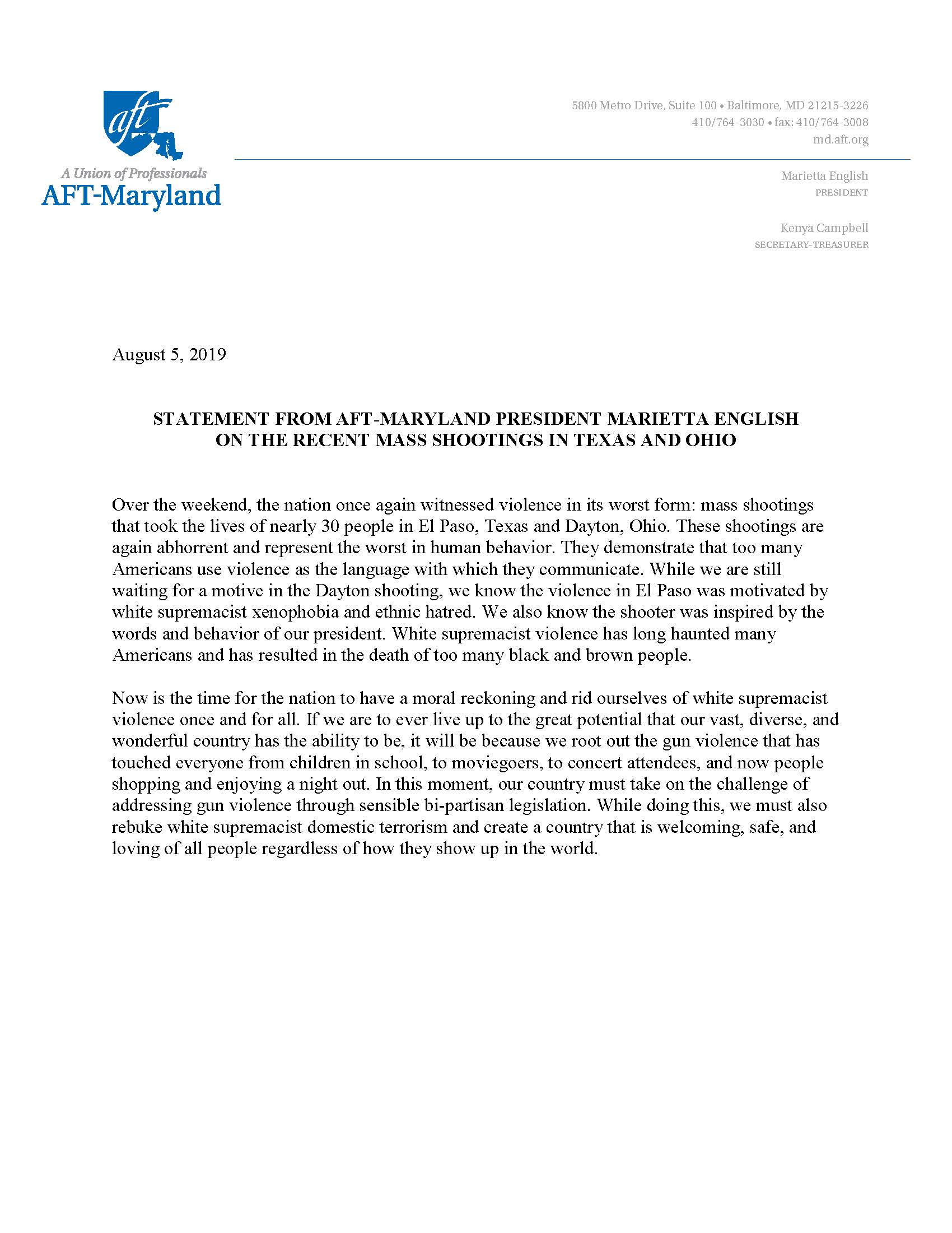 STATEMENT FROM AFT-MARYLAND PRESIDENT MARIETTA ENGLISH