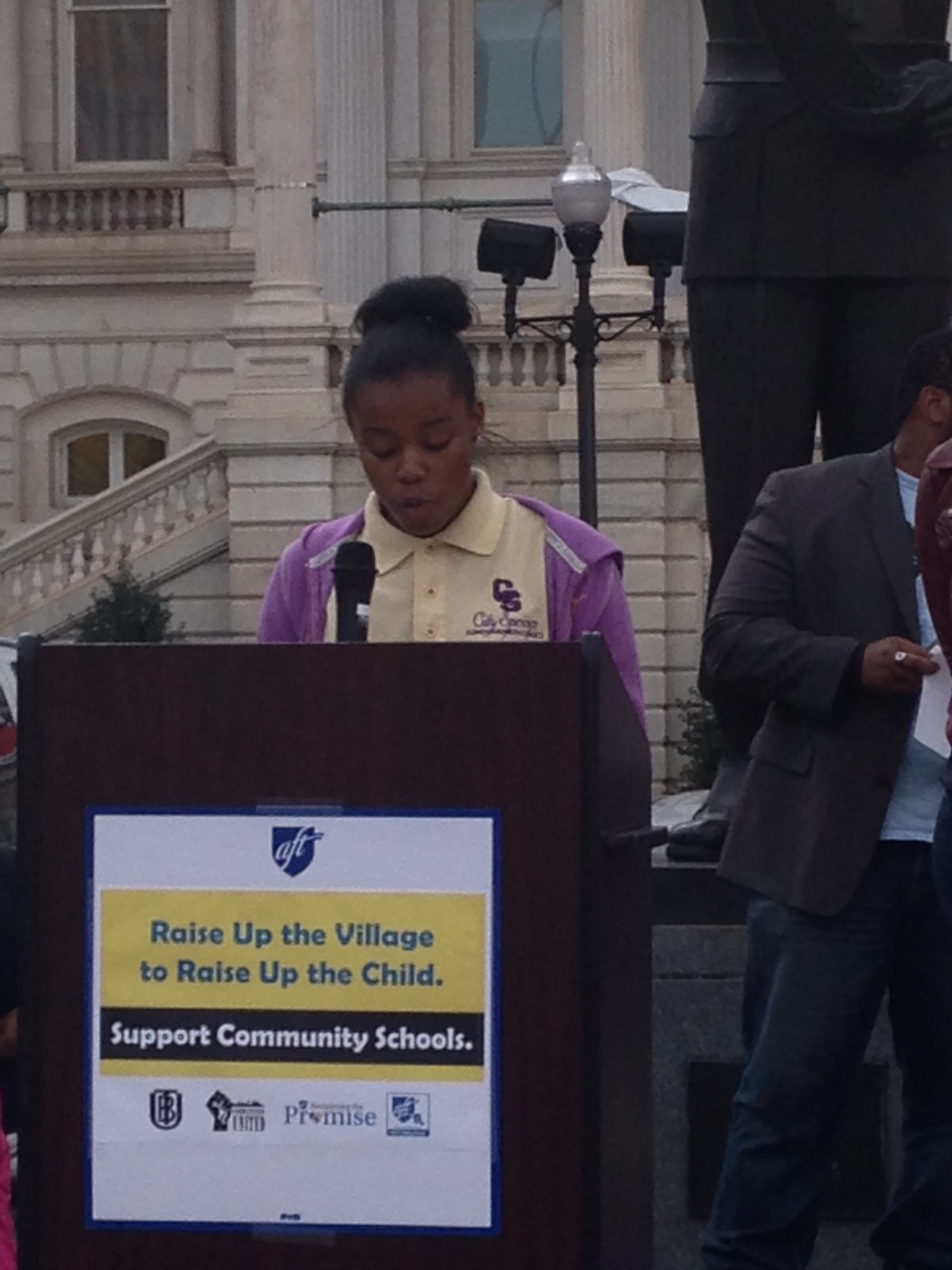 Hundreds descended on City Hall Tuesday afternoon, 10/21/14, to support a call for expansion of Baltimore's community schools. Principals, parents, elected officials, and students gave remarks calling on the City Council to support a resolution that would increase funding for community schools.