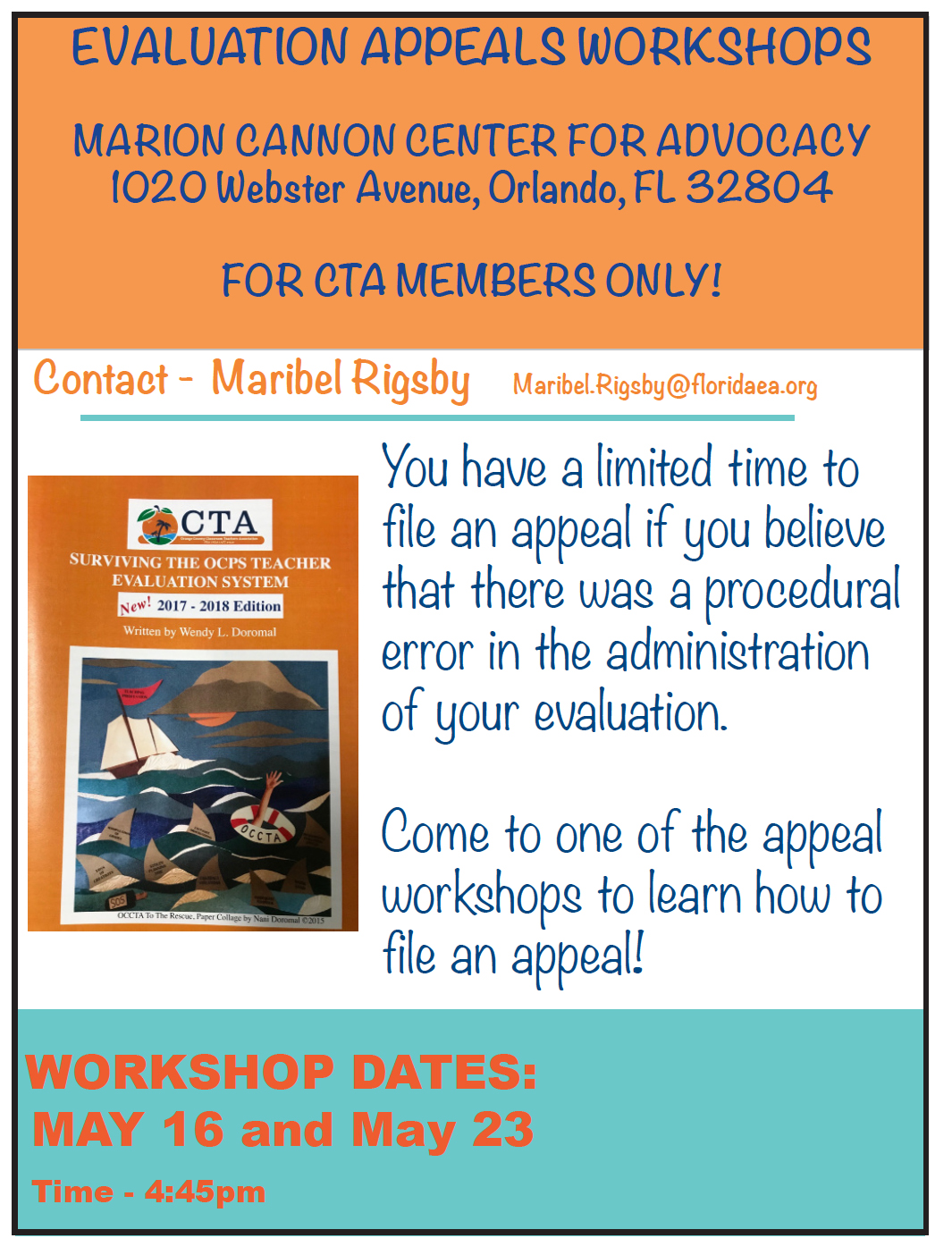 Instructional employees have the option to either grieve or appeal a procedural error concerning their evaluation score. This form below is for an appeal.  Please inquire with your Field Representative at 407-298-0758 or orangecta@gmail.com for further information.